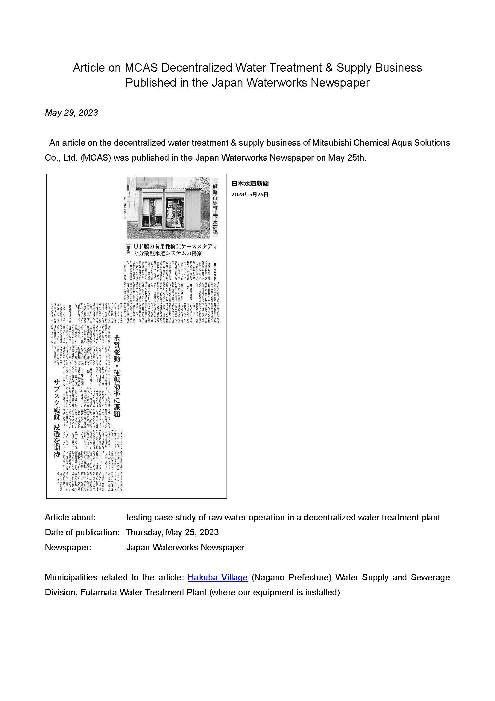 HOME News & Topics Article on MCAS Decentralized Water Treatment & Supply Business Published in the Japan Waterworks Newspaper News & Topics Article on MCAS Decentralized Water Treatment & Supply Business Published in the Japan Waterworks Newspaper May 29, 2023 Return to list page
